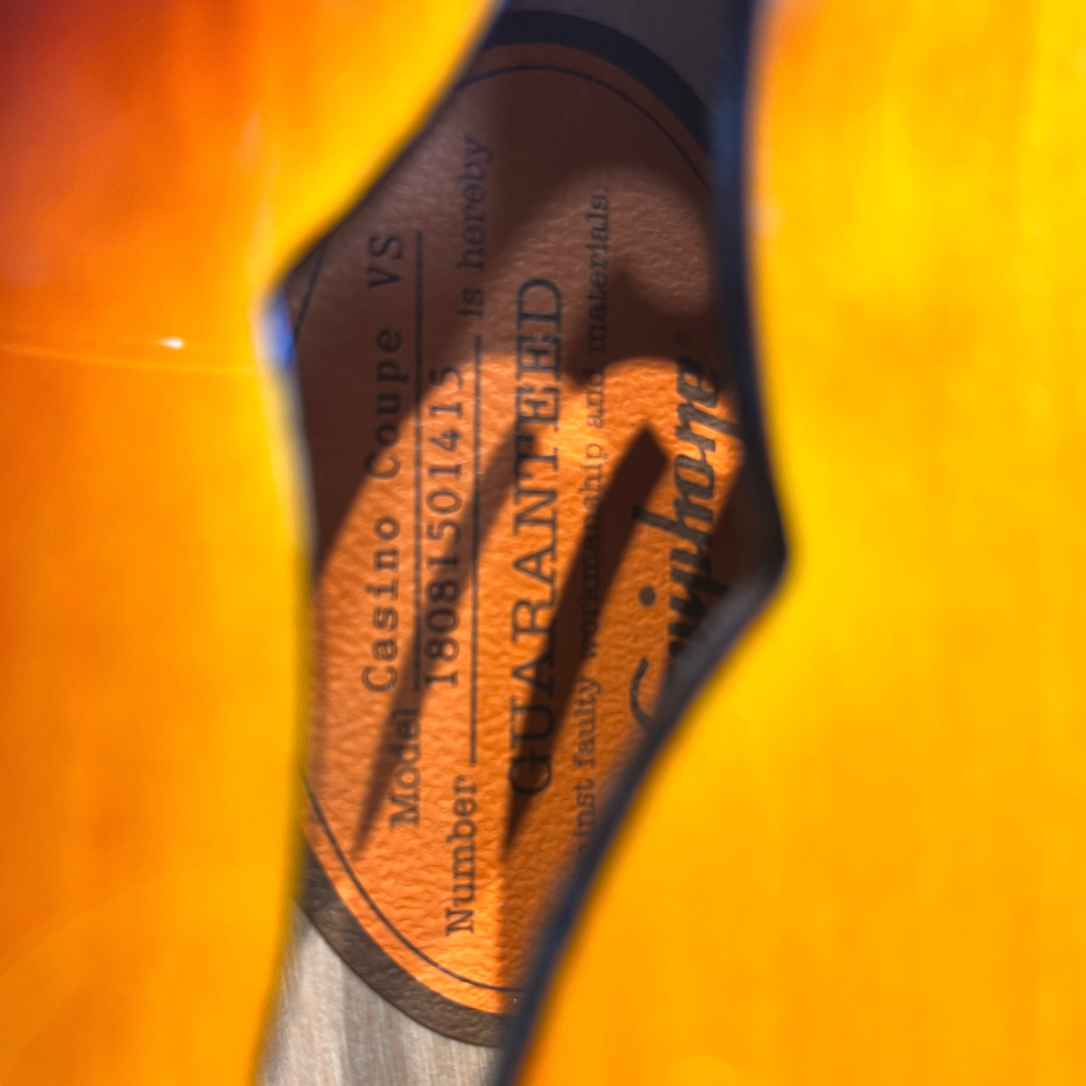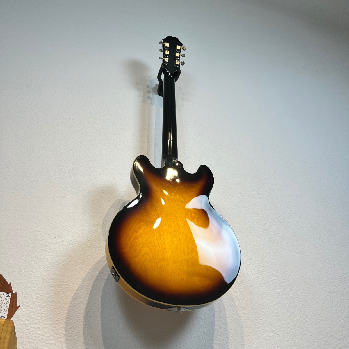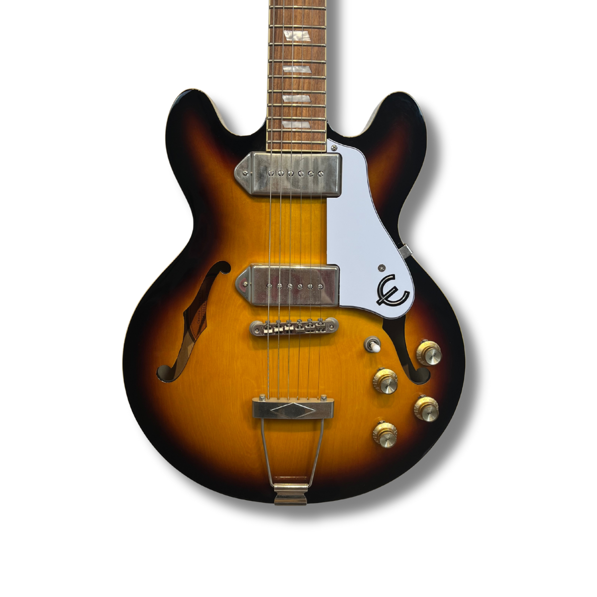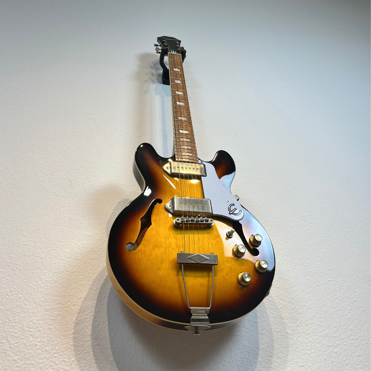 Guitarra Epiphone Casino Coupe no clássico acabamento Vintage Sunburst, em estado impecável. Modelo archtop de corpo semi-oco (hollow body), com construção leve, excelente ressonância acústica e timbre rico em harmônicos.